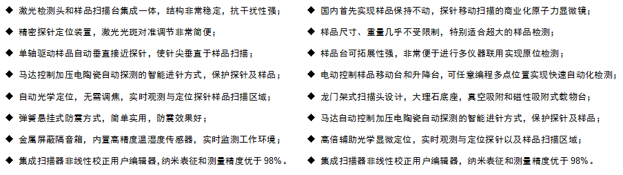 将我司基础型原子力显微镜(FM-Nanoview1000 AFM)和探头扫描式原子力显微镜(FM-Nanoview LS-AFM)做对比,不难看出我司新研发的探头扫描式原子力显微镜(FM-Nanoview LS-AFM)打破了很多传统原子力显微镜结构上和测样样品上的局限性,是*先量产化商品化的,能实现样品不动,探针移动扫描的原子力显微镜。打破以往原子力显微镜对测样样品尺寸、重量的局限性。在适用超大样品测样的同时,飞时曼也将样品台的可拓展性增强,实现便捷的多仪器联用原位测样。更可根据客户需求,订制化探头扫描式原子力显微镜。广泛应用于半导体材料与石墨烯材料的测样研究中。