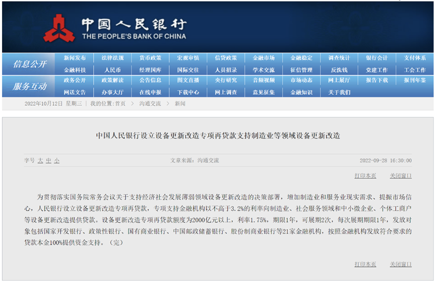 而9月28日,又一政策落地,中国人民银行宣布设立设备更新改造专项再dai款,额度2000亿元以上,支持金融机构以不高于3.2%的利率向10个领域的设备更新改造提供dai款,加上此前中央财政贴息2.5个百分点,今年第四季度内更新改造设备的dai款主体实际dai款成本不高于0.7%。